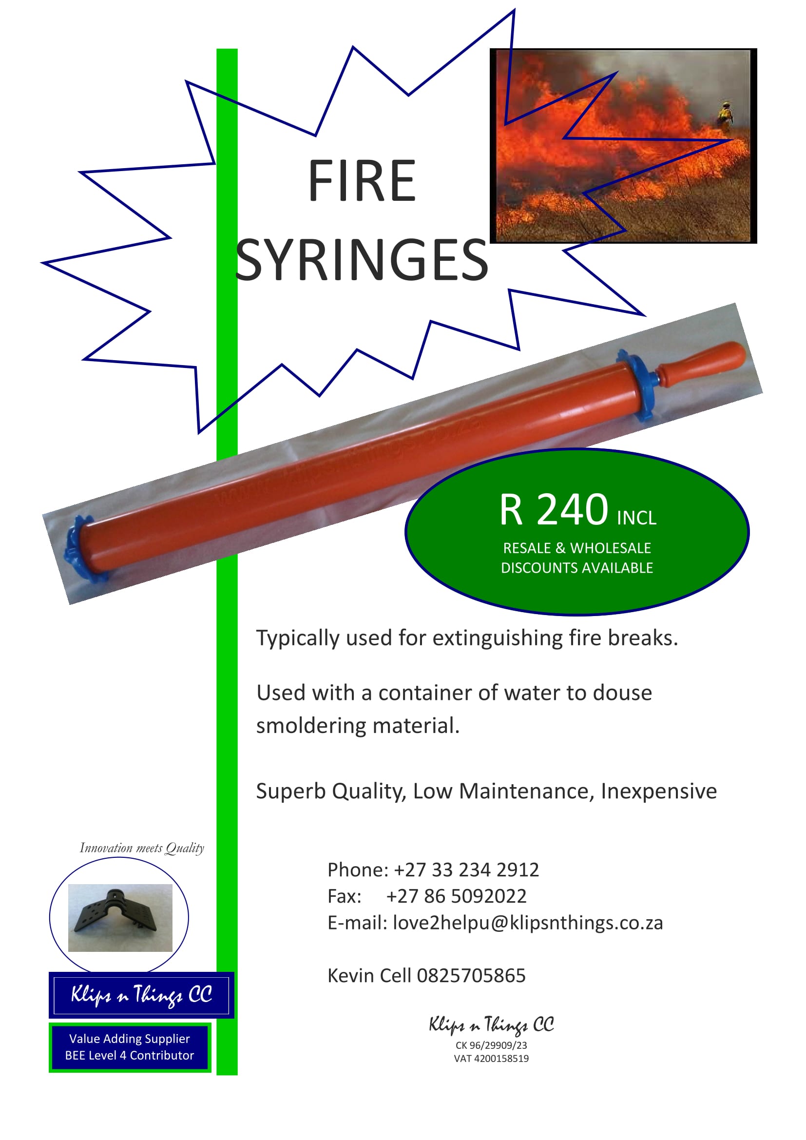 Fire Syringes shoot out a powerful spray of water. They are brilliant for putting out smoulders when burning firebreaks. The fire syringe tube is 550mm long. The internal diameter is 40mm and the outside diameter is 50mm. When the plunger is pushed in the overall length is about 700mm.